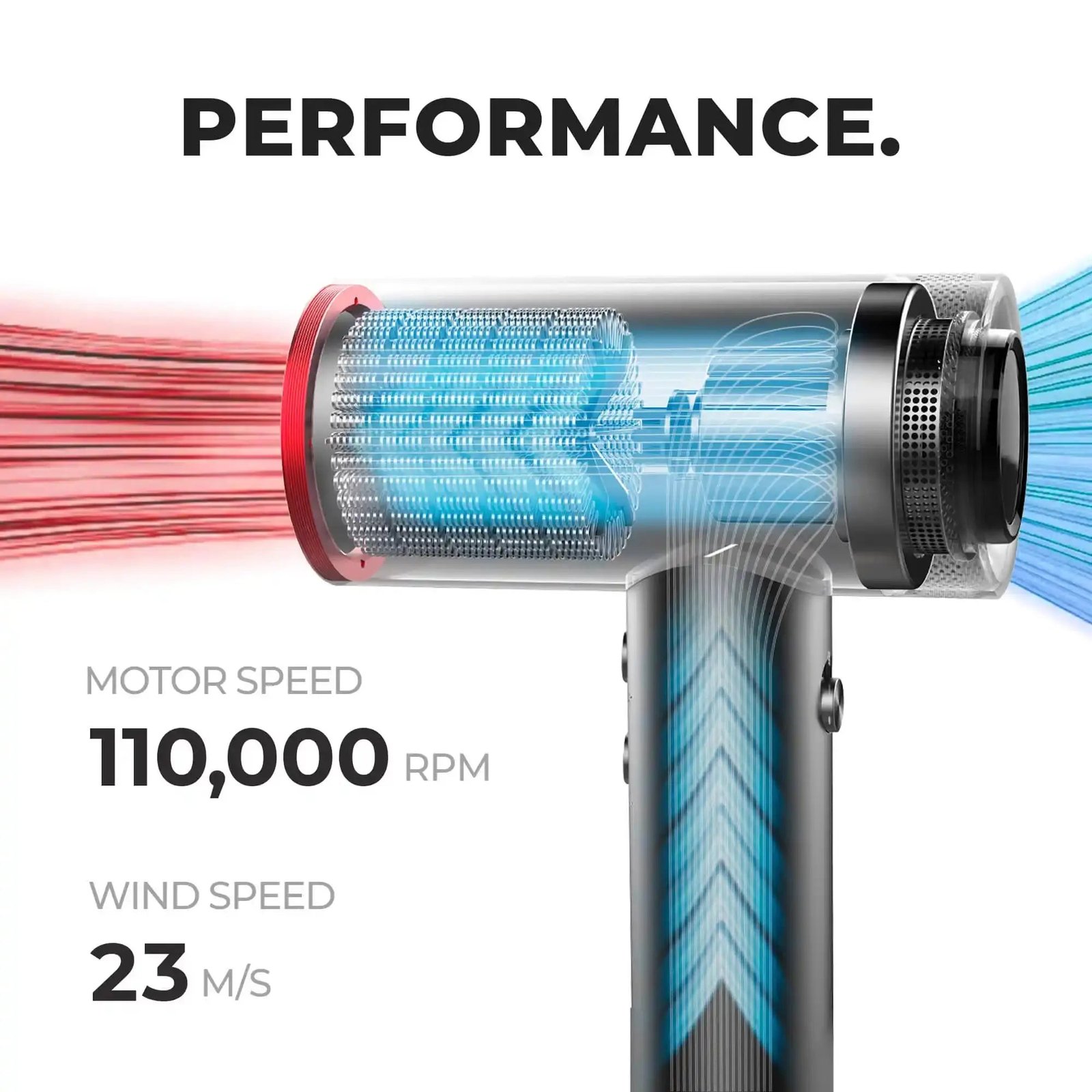 TYMO AIRHYPE Hair Dryer boasts maximum 110,000 RPM and 23 m/s wind speed superior to most mainstream hair dryers, not to mention its 4 precise temperature options and 3 speed settings, etc. Speediness and No Damage is what we have been striving for.